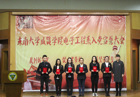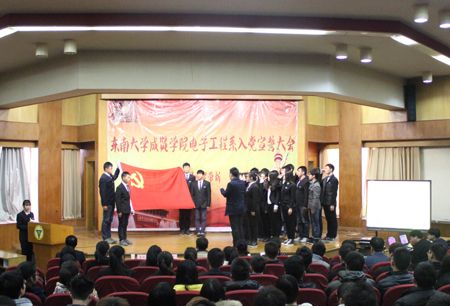 12月29日下午,电子工程系党总支举行新党员入党宣誓仪式及“洽电子少年”党建微信平台发布会。本次大会主要以加强党的基层组织和党员干部队伍建设为基础,全面加强和改进党的思想、组织、作风和制度建设,提升党员整体素质,树立党的光辉形象。学院党委副书记、副院长王荣,组织人事部李秀琴老师,系党总支副书记杨阳,系党总支组织委员、综合办主任羊栋,系党总支委员、分团委书记宋奎以及各党支部书记、辅导员老师参加本次大会。