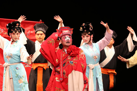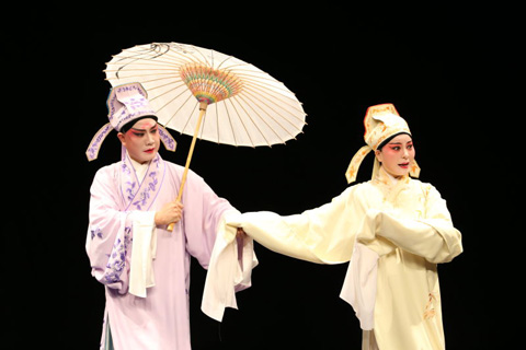 演出从梁山伯与祝英台在求学之路上偶遇结拜为兄弟开始,祝英台的扮演者龚隐雷唱腔清丽优雅,将一个女伴男装的大家闺秀演的活灵活现。两人在众学生中表现优秀却结识了宦官子弟马文才,丑角马文才的饰演者李鸿良,通过在私塾嬉闹轻佻的舞台动作、面部细微的表情与繁多的细微动作,将狡诈、见色起意的马文才完美地表演出来,赢得现场阵阵掌声。随着剧情的发展,当梁山伯与祝英台依依惜别祝英台托书童送定情信物点醒梁山伯时,场下响起一片叫好声。而在最后一场化蝶章节中,祝英台一袭火红嫁衣,声泪俱下,最终投入梁山伯的坟墓双双化蝶归去,将悲剧气氛渲染到极致,带动观众投入了这个凄美的爱情故事。演出中每一段剧情之后观众都给予热烈的掌声,谢幕时现场观众更是起身鼓掌,掌声在报告厅中久久回荡。