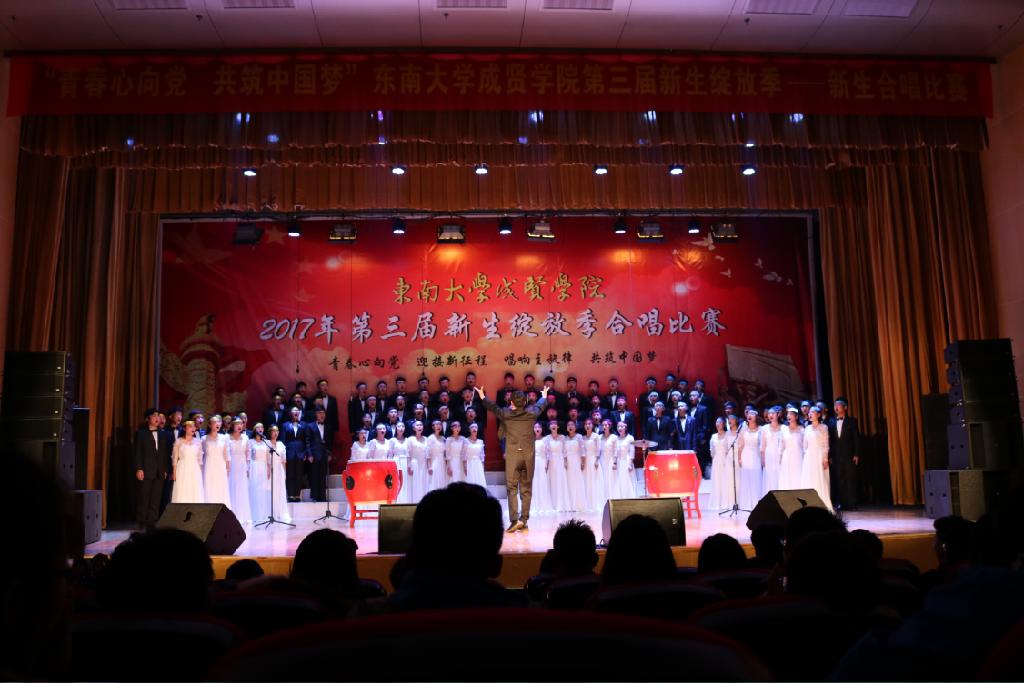 本次比赛电子与计算机工程学院合唱队在学院领导的关心支持下,由分团委学生会牵头,在侯翀(外聘)、宋奎、陈以藟、王晶晶老师的细心指导下,辛勤付出历经两个多月的紧张排练。期间大家克服了排练场地紧张、排练时间不集中等诸多困难,最后以饱满的精神状态和多样的艺术表现力打动了在场的所有人。比赛中电子与计算机工程学院以一首由南京艺术学院作曲系主任臧恒教授和苏文婷教授吸取中国京剧中“苍”和“台”两元素原创的《青春绽放》诠释了我们当代大学生“放飞青春梦想,书写时代华章”的精神风貌,并凭借必选曲目《东南大学校歌》的激情澎湃的演艺获得评委老师和全场观众的一致好评,并荣获了本次合唱比赛二等奖的好成绩。
