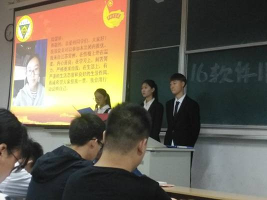 2017年10月10日,16软件1团支部作为示范班级举行了本支部第二次团内推优大会。下午6点,同学们齐聚文昌403,前来观摩此次推优大会的有16级电子与计算机工程学院其他支部的班长和团支书,以及17级班级代表。此次大会我们还有幸邀请到了经济管理学院辅导员苏珍晶老师,以及我院分团委副书记王怀鹏作为此次推优大会的特邀嘉宾。6点半,团内推优大会正式开始。本次团内推优大会共有五项议程:一、奏团歌,二、支部介绍及概况,三、宣读团委文件,四、候选人自我介绍,五、民主评议。