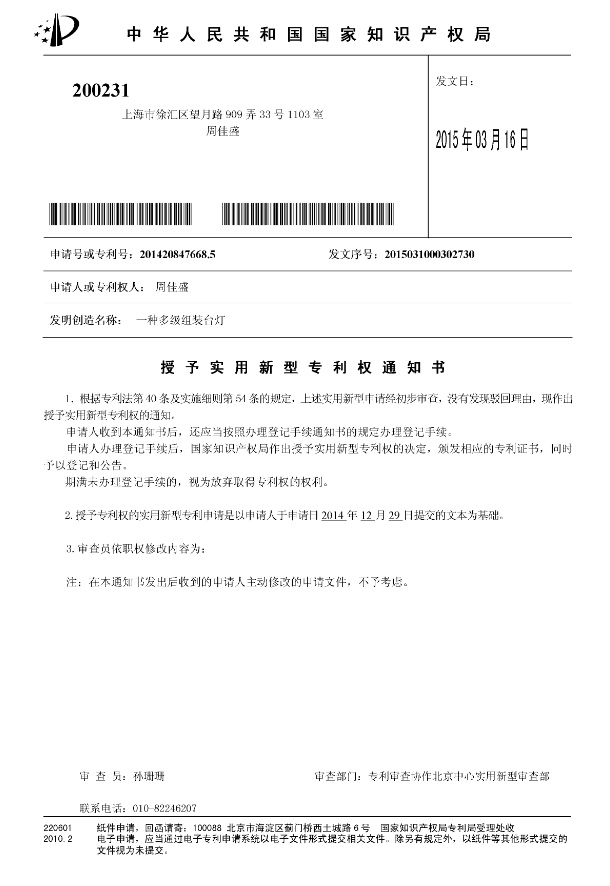 近日,我院计算机工程系2014级计算机科学与技术2班周佳盛同学申请的两项专利获得了国家知识产权局的正式授权,成为国家实用新型专利“一种多级组合台灯”(专利号201420847668.5)以及“一种复合型触摸屏”(专利号201420852211.3)两项专利的第一专利权人。